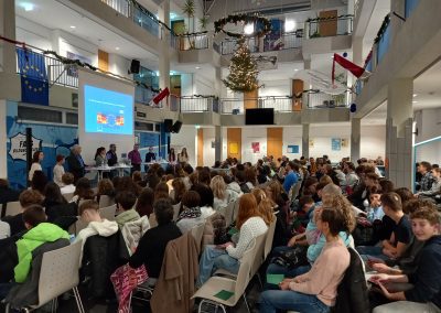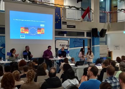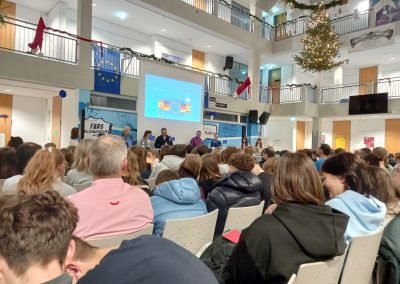 Am Donnerstag, den 11. Dezember, probten beide Gruppen daher erstmals gemeinsam den Ablauf. Am Abend war die Aufregung groß: Vor über 200 Gästen fand die Podiumsdiskussion im Lichthof statt.